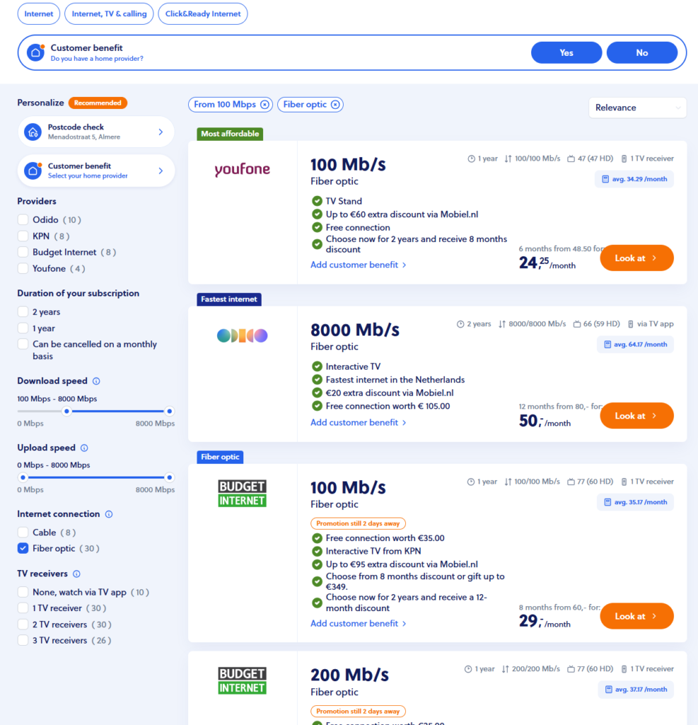 Once you input the details, you will be redirected to the Mobiel.nl website, where you will see all available options. The website separates the options into categories, such as “affordable”, “fastest”, and among others it also shows the terms for the contract.