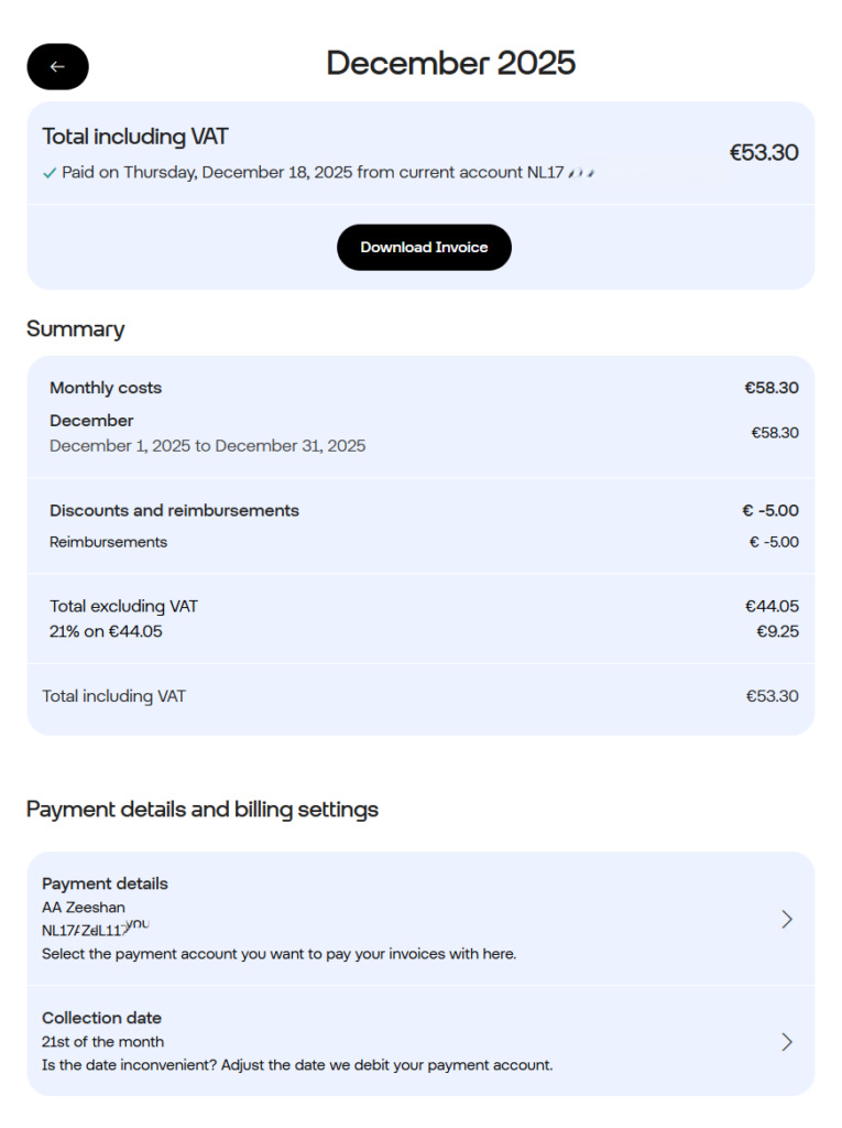 This is the invoice for the month of December 2025. The fixed monthly costs are EUR 58.30 and I receive a discount of EUR 5 because I have two other connections (Odido offers a EUR 2.5 discount per connection on the same house address). The invoice is paid automatically from my bank account and I just recieve an email notification that everything is clear.
